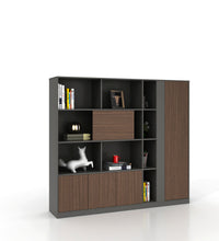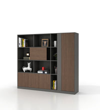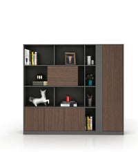 Crafted in a striking combination of walnut wood grain and matte graphite grey, this unit features clean lines and a minimalist design, perfect for showcasing decor, organizing books, and concealing clutter behind sleek doors.
